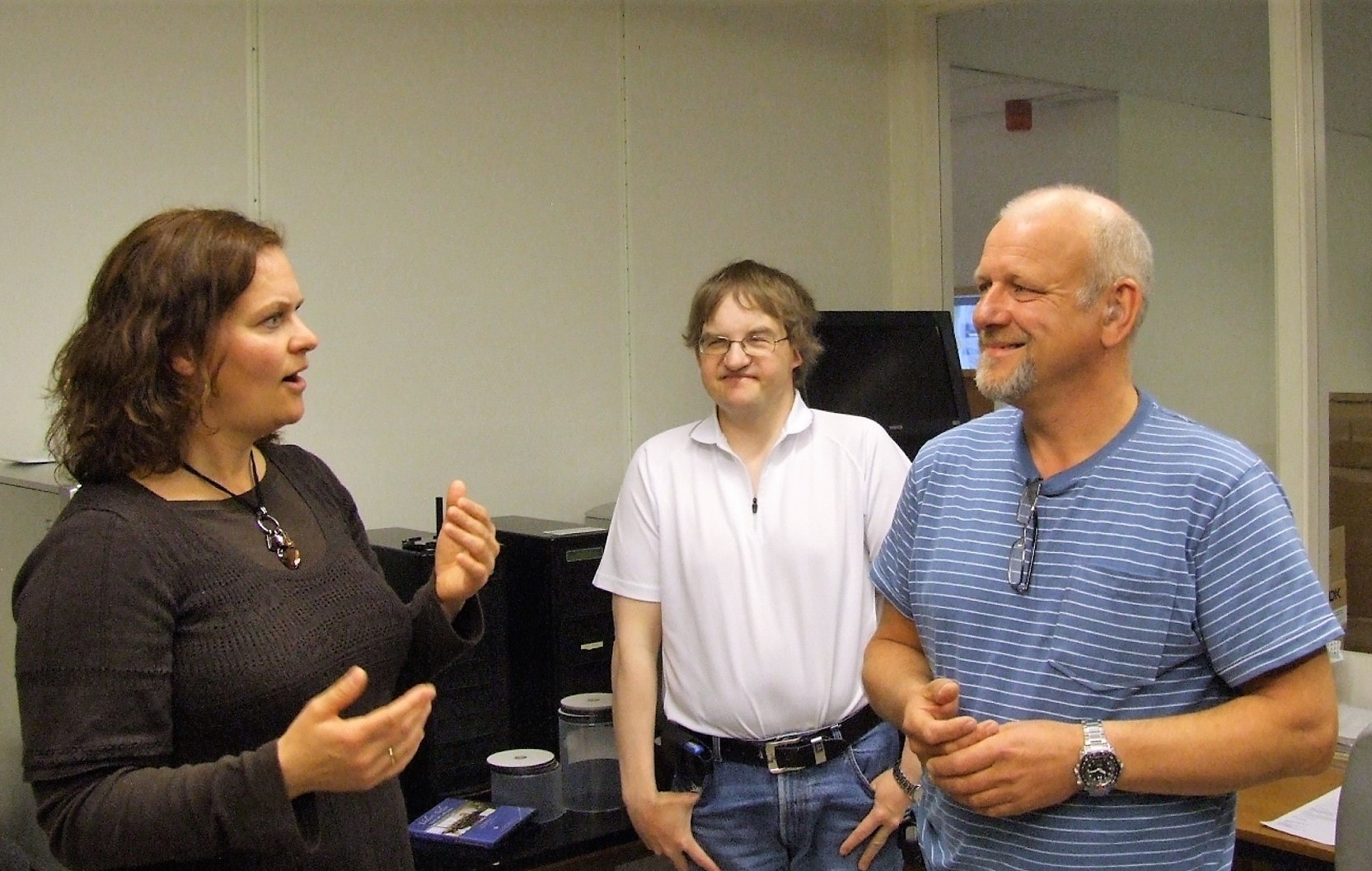 – Men det han ser, ser han skarpt. Han ser när vi talar teckenspråk med honom. Därför behöver vi inte använda oss av taktilt teckenspråk. Dessutom har både han och vi andra olika hjälpmedel, säger Gunnar Fauskganger och pekar på en dataskärm som är kopplad till en videokamera. Den kan förstora vanlig skrift så att den blir decimeterstor. Själv använder han en apparat som visar ljudet grafiskt när han t ex ska hitta en lämplig punkt att lägga in ett reklaminslag.