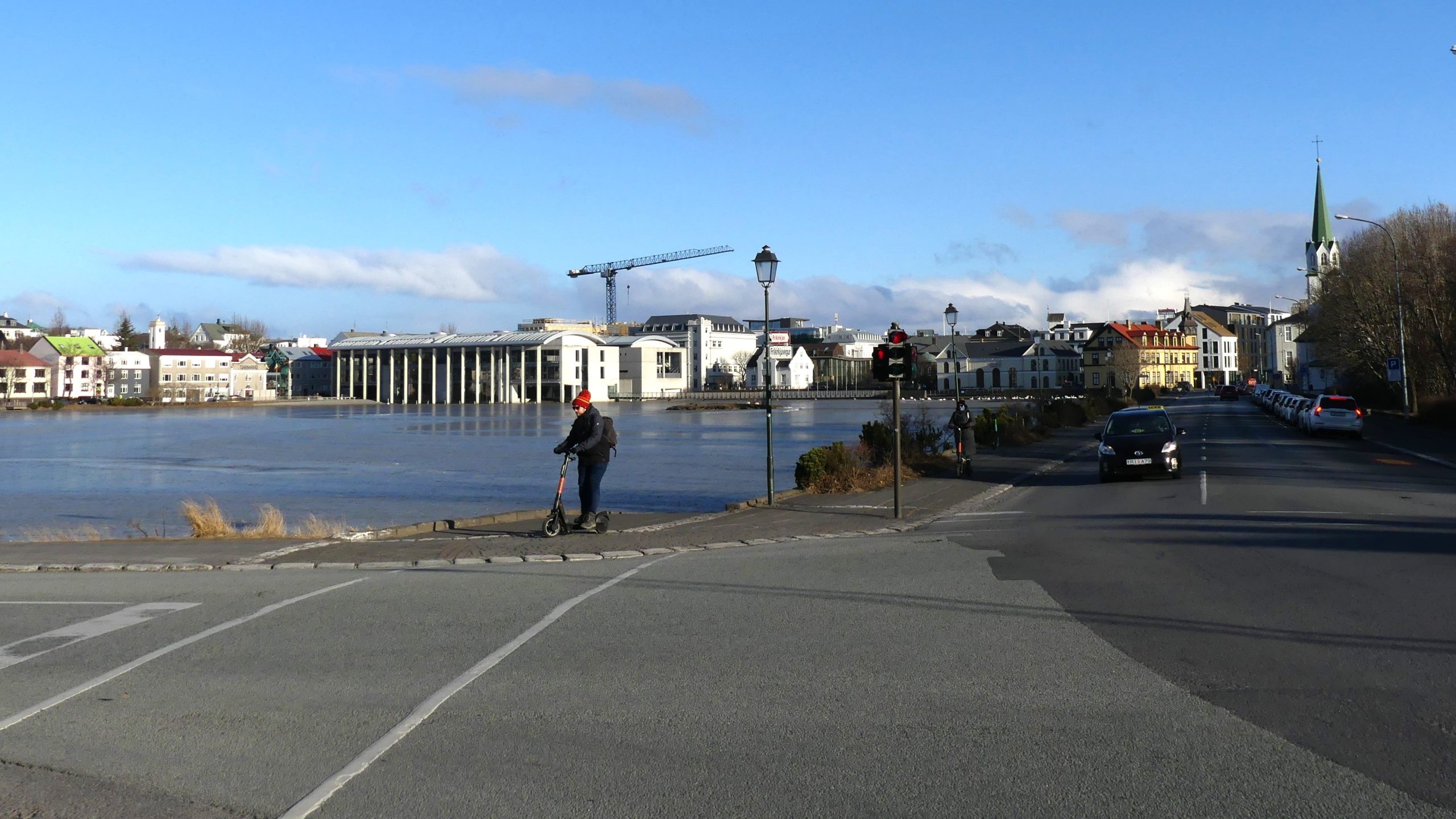 Harpan ligger vid hamnen med en fasad som konstnären Ólafur Elíasson designade tillsammans med arkitekterna. Den reflekterar havets glittrande färger som fjällen på en fisk. Luften i Reykjavik är klar och utan föroreningar, men det var inte alltid så, förklarar Logadóttir. Hon visar en bild av Island från den tiden som den huvudsakliga uppvärmningskällan var kol och ett mörkt rökmoln ofta svävade över Reykjavik.