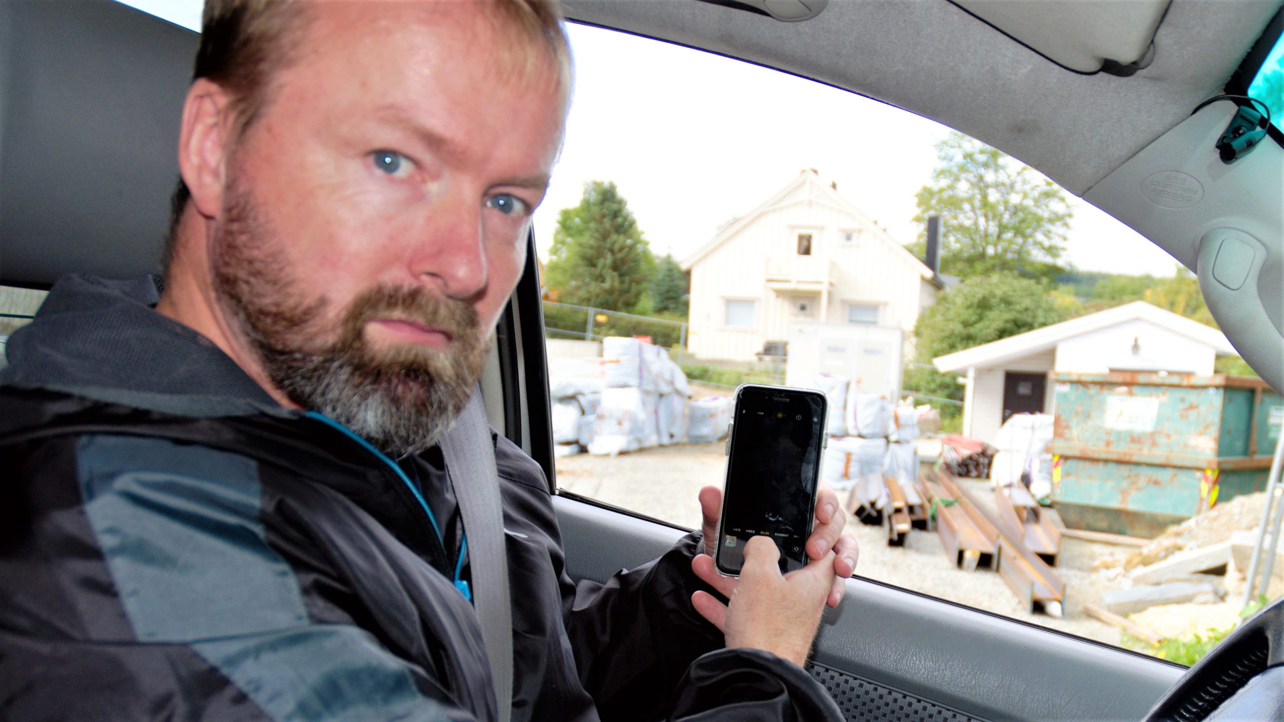 Et stykke inn i sideveien viser den seg å være blindvei. Da blir det hastverk for nå har vi bare en vei ut. Sagmyr ruller ned vinduet og snapper frem telefonen. Tar effektivt bilder av materialer og firmabilene med logoene på byggeplassen. Avstanden er kanskje 30 meter, men arbeiderne er inne i en bygning.